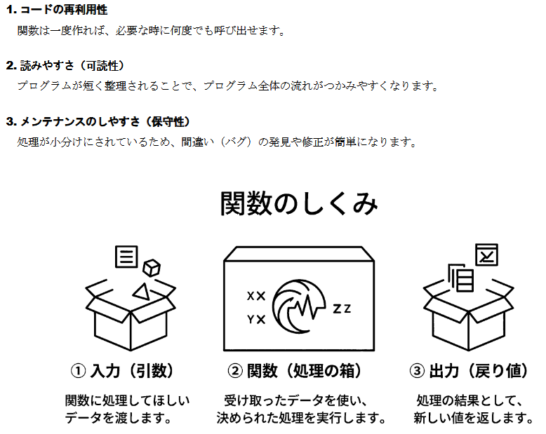 この章では、関数について説明していきます。関数とは、プログラム内で何度も利用する命令を一つにまとめた「再利用可能なコードの集まり」のことです。特定の入力を受け取り、処理を行った結果を返します。JavaScript も、この関数を定義することにより、関数の仕様にしたがって、あらかじめ決められた機能を繰り返し操作することができます。例えば、引数として与えられた2つの値を合計したり、或いは、2つの文字列を結合することができます。ここまでで Java を学んできた皆さんには、既にメソッドとして慣れ親しんだ概念ですが、JavaScript には JavaScript 固有の関数の記述方法があります。もう一度、関数の仕組みや関数をつくるメリットを振り返りながら、JavaScript でのいろいろな関数の記述方法について、プログラムを作りながら理解を深めていくことにします。