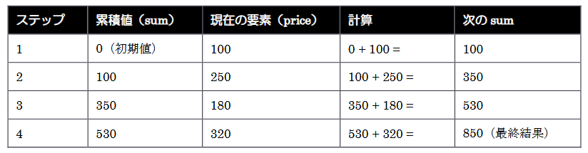 各ステップで「sum + price」を計算した結果が、次のステップの sum として引き継がれます。