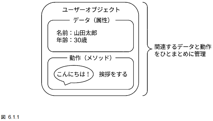 ユーザーには「名前」や「年齢」といったデータがあり、「挨拶をする」といった動作が考えられます。これらをバラバラの変数(userName, userAge…)で管理するのではなく、ひとつの「ユーザーオブジェクト」としてまとめて管理するのが、オブジェクト指向の基本的な考え方です。