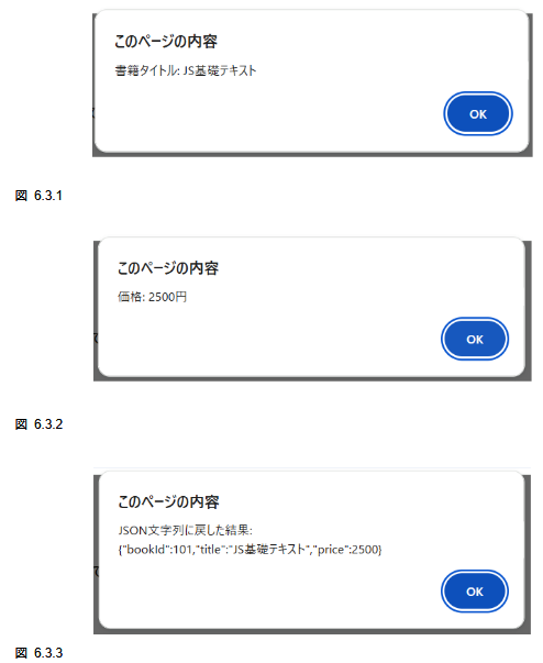 オブジェクトになった後は、bookObj のプロパティから、ドット(.)キーを使って値を取り出せるようになります。11 行目と 12 行目では、title と price というキーのプロパティから bookObj.title と bookObj.price でアクセスして値を取り出し、その結果を alert で表示しています。