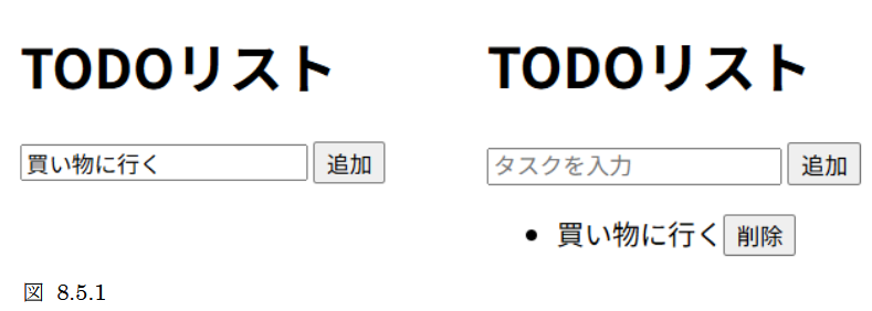 入力フィールドにタスクを入力して「追加」ボタンをクリックすると、リストに新しいタスクが追加されます。各タスクの横には「削除」ボタンがあり、クリックするとそのタスクが削除されます。