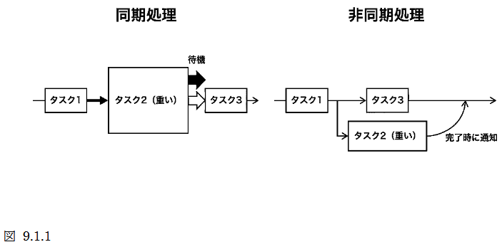 通常のプログラムは、書かれた順番に一行ずつ実行されます。プログラムは、現在実行中の行の命令での処理が終わるまで、次の行の処理を実行するのを待ちます。これを同期処理(どうきしょり)と言います。それに対して非同期処理(ひどうきしょり)は、ある行の処理が終わるのを待たずに、次の処理を進める仕組みです。